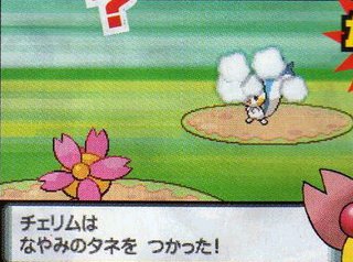 新PM中的チェリム是草系,属于樱花神奇宝贝.特性为フラワーギフト(花之馈赠),晴天时可以提升自己和队友的能力.它还会一招なやみのタネ(麻烦种子),可以暂时将敌人的特性改为失眠(....可以改鬼蝉的特性吗...钢鸟,卡比,河马....那些BT都睡不着了吗...)