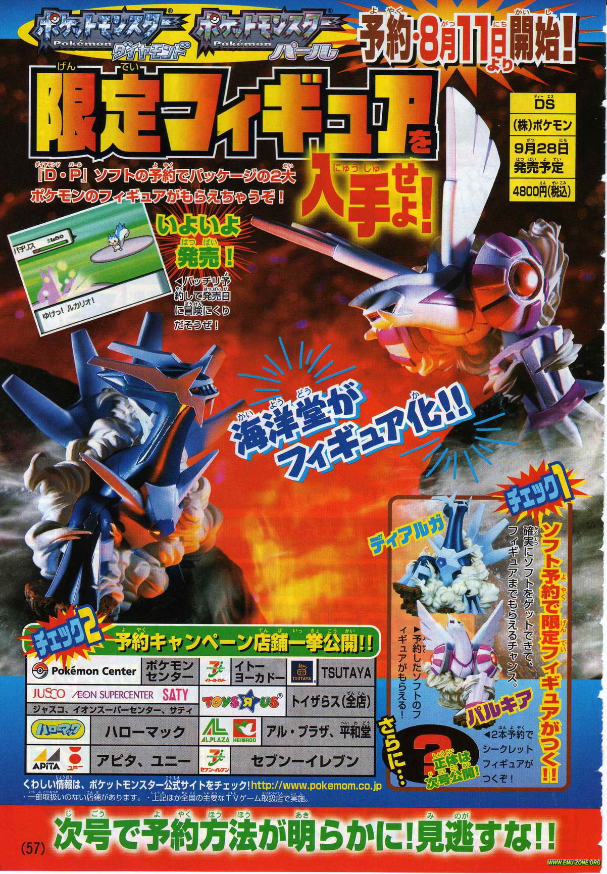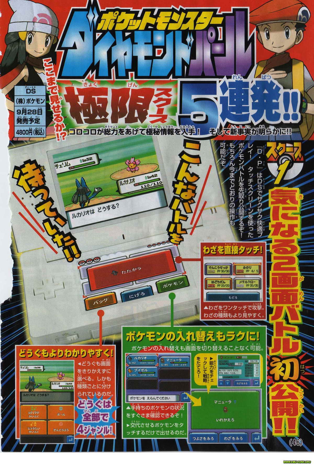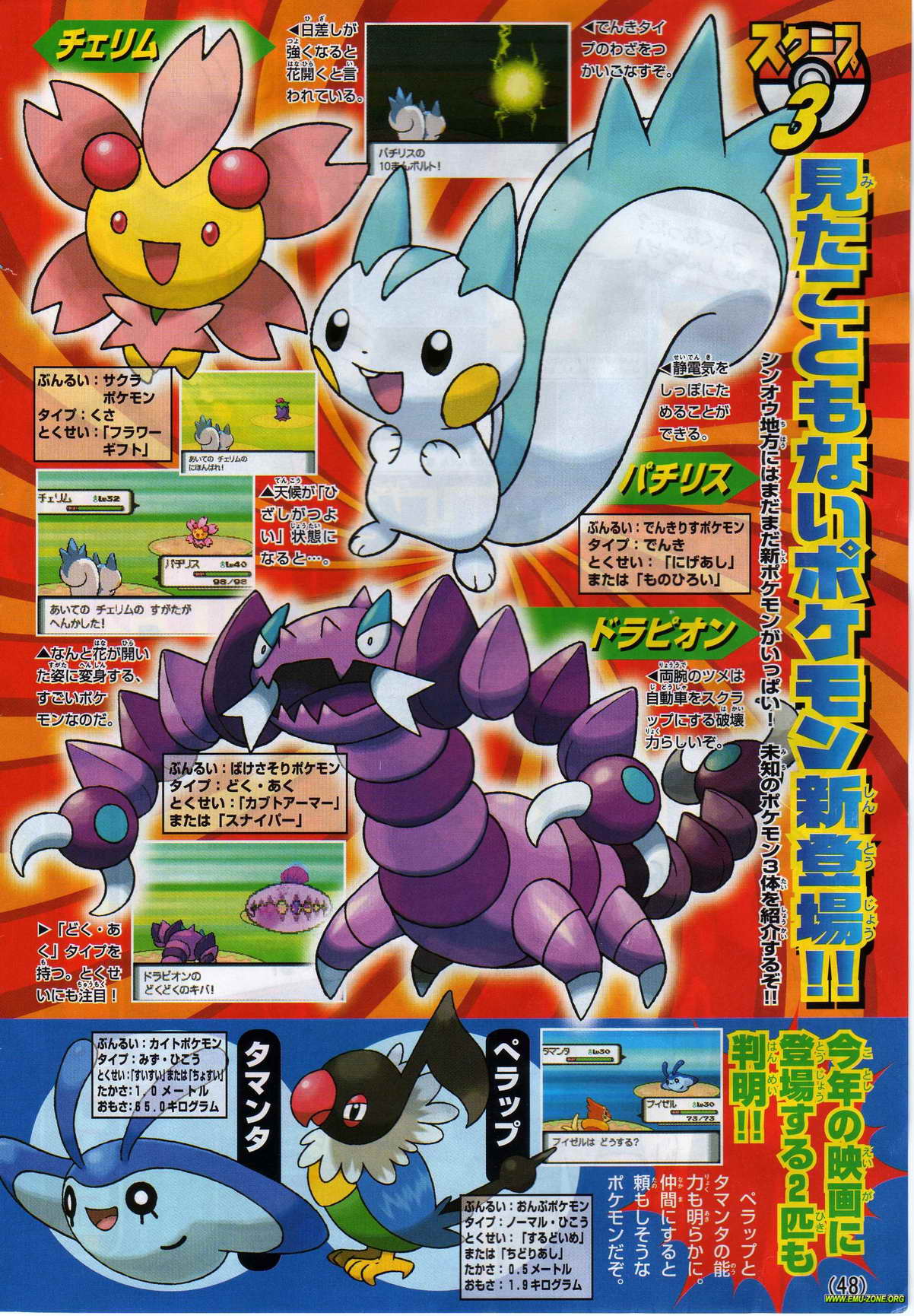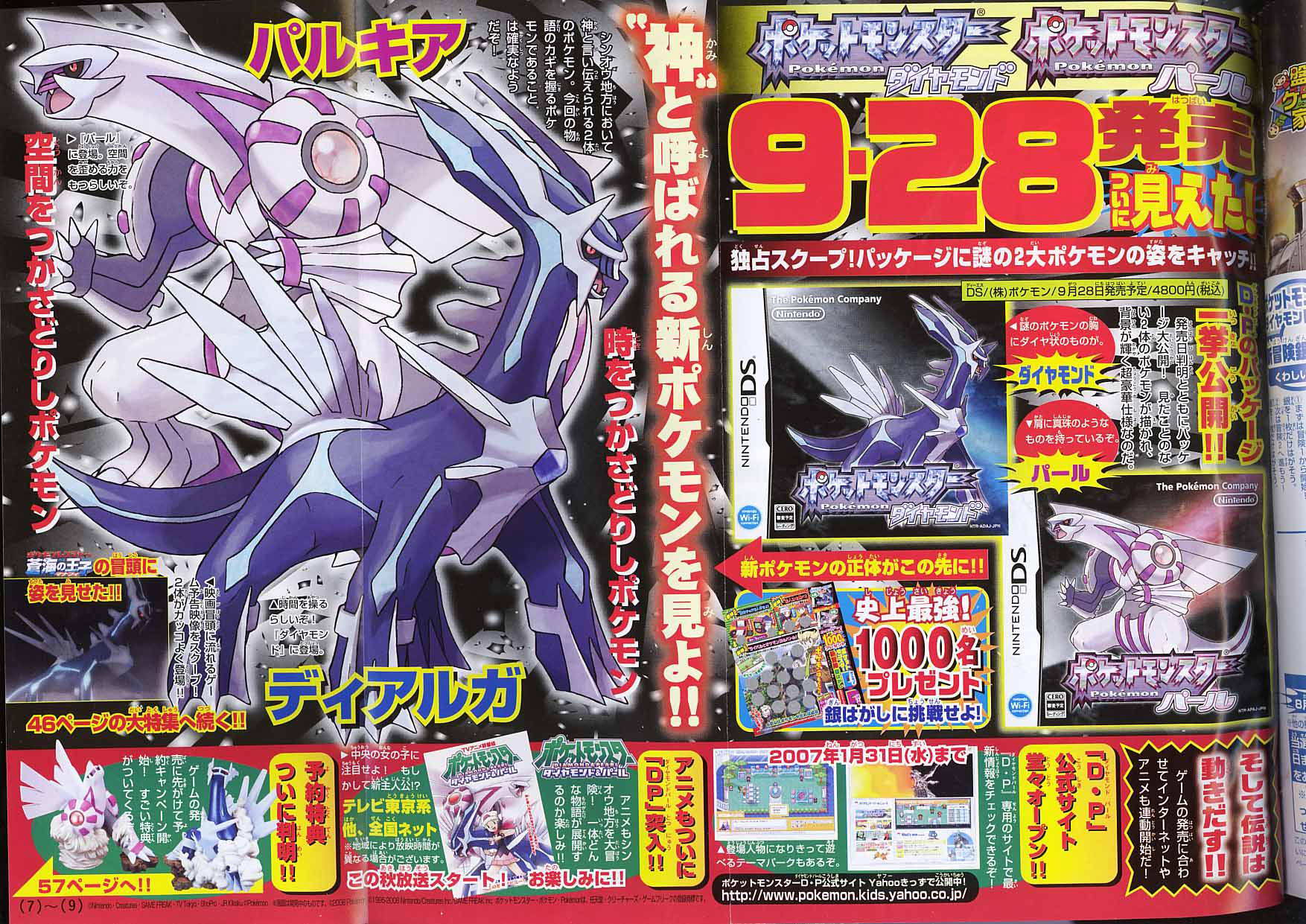 先来看一下几个重要的更新点~ 1.发售日期拟定在2006年9月28日. 2.三星期前放出的新神兽名称定为ディアルガ(Diaruga)(钻石版)和パルキア(Parukia)(珍珠版).ディアルガ为时间操控精灵,パルキア为空间操控精灵. 3.3只新精灵--チェリム(Cherimu),パチリス(Pachirissu),ドラピオン(Dorapion)形象公布.