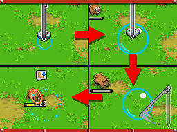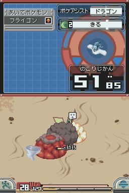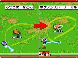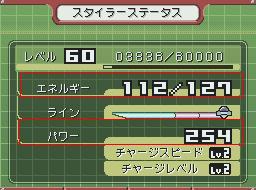 每圈心情增加的数值,理论上等于主角陀螺上显示的威力(パワー),实际上还要根据属性相性进行修正,后面会具体说明. 小精灵会使出各种技能对画圈进行攻击,当画圈的轨迹被攻击到时,线会断裂,同时陀螺减少一定的能量(エネルギー),当能量减少到0时,便算作游戏失败,需读取最近的存档方可继续. 如一段时间未画圈,小精灵的心情值便会减少.不同小精灵心情值减少的速度也是不同的.总之为了不使其减少,请尽量别在一段时间内毫无斩获,至少象征性地画下吧. 捕获界面如下: