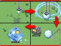 <------冰 特效:可以使用冰球攻击小精灵使其成为麻痹状态. 使用方法:用笔点击触摸屏,即会形成冰球,耍出去击中小精灵便可造成伤害并产生特效.可以通过画圈使冰球增大,威力和特效时间随之增加. 伤害修正:冰球攻击---0.5/1/2(根据冰球大小),画圈---1.