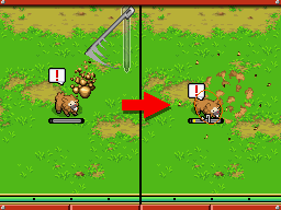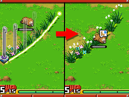 <------草 特效:可以使用高草攻击小精灵使其成为钝足状态,对飞行系和漂浮类小精灵无效. 使用方法:用笔在触摸屏上画线,线的轨迹会长出高草,一旦小精灵踩中即产生特效. 伤害修正:画圈---1,无属性修正.