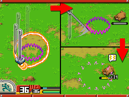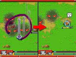 <------超 特效:可以使用念力攻击小精灵使其成为麻痹状态. 使用方法:用笔在触摸屏上画圈,圈中心会产生精神圈.用笔将精神圈耍出击中小精灵便可造成伤害并产生特效.精神圈在中途可通过控制改变方向. 伤害修正:念力攻击---1,画圈---1.