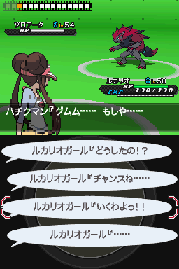 set h1首发出场,属性是恶+超,我方有两只路卡,第二只会连续切是达成条件的关键后述 首先我方第一只路卡先用电光石火摸他一下,这样他的道具红按纽会消耗掉把佐罗亚克伪装的秃鹫换上场 下一回合先用忍耐承受火射的攻击,次回合用起死回生把佐罗打残,但因为其携带气息腰带所以第一只路卡必须牺牲了,阿门 换上第二只后台词出现,选择