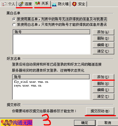 申请完毕后点击主界面左下角的“登陆”按钮进行登陆。 之后点击下方的“配置”按钮,选择“关系”选项卡,在好友名单中添加好你朋友的ID,然后点击下方的“提交改动”确认操作。(如图3)