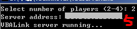 解压缩后,在文件夹内有个vbaserver.exe文件,这个是创建服务器程序,打开它。 打开后他会问你有多少个玩家要联机,我们这里以2位为例,输入2,按回车。 现在就已经创建了服务器了,上面的Server address旁边写的是你的服务器IP地址,记住它。(如图5)