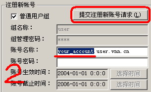 现在要先申请个帐号。点击右下角的“帐号”进行申请。 如图2,在帐号名称那里写上你的ID(你的名字必须写在your_account那里,否则格式不对,系统会不承认)。写好后点击上方的“提交注册新帐号请求”就可以了。如果申请失败的话就关掉防火墙多试几次。