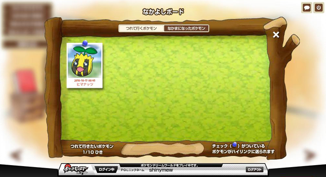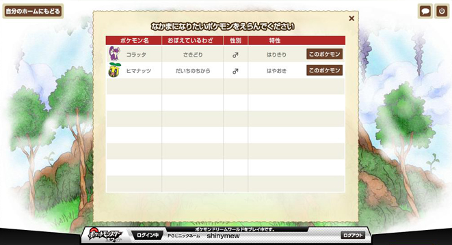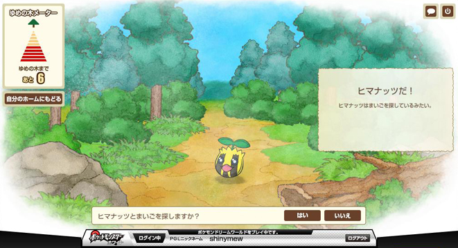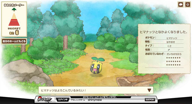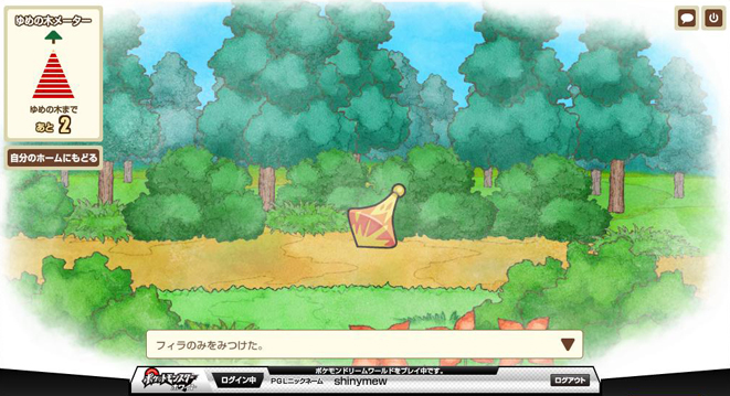 走完十步之后会来到一棵大树,上面的气泡里飘着很多PM(我也不知道干嘛的,反正我两次看到的PM不一样) 这里就能选择刚才路上遇见的一只PM并带回家了,不过必须消耗一个树果。 PS:这里选择不带PM回家的话可以多次去森林刷,而且之前遇见的可以保留……只是要注意一下登录的时间,超时自动退出可就亏大了哦。