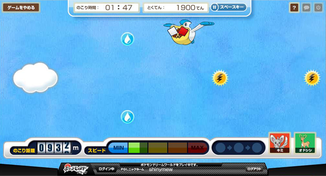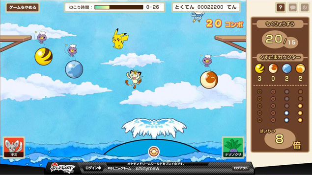 吼鲸王喷水: 叉尾浮鼬、皮卡丘、圆企鹅、喵喵四只PM分别对应四种不同花纹的球,碰对的话球会消失并且加分,同种球累计一定数量的话总分会有倍率加成。 PM数量会随着时间增加,最多时四个,要移动吼鲸王接住或喷水让PM不掉下海,接到PM离水柱中心越近,向上弹得就越直,离中心远一些的话就能斜向弹起了。 一旦有PM掉下海的话……总分倍率会清除!所以一定要小心。 上次还剩半分钟时我的倍率有8倍,可是后来还是不小心掉了一个~~(>_<)~~