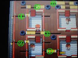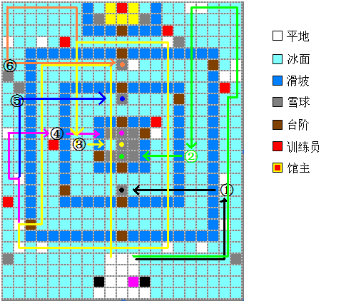 [KD8 zapdoszwq版权所有,请勿转载]一、クロガネシティ岩石道馆如图只需一直向前即可,不想打训练员可以从上面绕着走二、ハクタイシティ草系道馆这里进去后会发现馆主的位置上并没有人,其实是需要找到藏在树丛中的4个训练员后馆主才会出现①②③④如图按顺序找到即可三、トバリシティ格斗道馆这里需要我们推动可以平移的那个挡路的东西,目标是将中间的一条路上挡路的都推开先看右边如图先将①向右推,然后向前走将③向右推,回来后从最右边向前走将⑤向左推,再回来后将②向右推开进去将④向右推,之后回到最右侧把②推回来,这样就可以走到头将⑥向左推了。然后看左边先从中间进去把①推到左边,向前把②③④也统统推到左边,然后从最左侧走到头将⑤向右推,顺便把①推回来,这样可以走到头将⑥向右推,至此中间的路就打通了,可以直达馆主。四、ノモセシティ水系道馆这里就是利用踩不同颜色的按钮改变水深,从而形成路线。进去后向前走到头左转再左转,踩这个黄色的然后向右,下到最底层,之后一直向前,来到这里踩这个绿色的然后往回走一点,来到这里踩这个蓝色的然后向下走到头向右走(注意不要踩那个黄色的),再向上一直走到这里,踩绿色的然后从最右边向下走,踩这个黄色的然后一直向上走到头,左转再左转,往回走一点后上2次台阶来到这里踩蓝色的之后就直通馆主了五、ヨスガシティ幽灵道馆这个很简单,走错门也没关系,因为训练员最好还是要打的,对150图鉴有帮助的按顺序是右、中、左、右六、ミオシティ钢系道馆这里结构看似很复杂,实际上过了开始的一个,后面都几乎只有一条路,一直走下去就好了第一个上这里另外这里到了最高层景色很不错,大家可以欣赏欣赏XD 照得不是很清晰请谅解七、キッサキシティ冰系道馆如图,道馆的平面图平地、台阶可以站住,冰面无法站住,从斜坡滑下可以打碎雪球,另外根据物理原理,从某高度滑下时最终可以到达相同高度的地方(……当然可以不必考虑如此复杂),总之我们的目标是清除所有挡在中央路线上的雪球如图按照①到⑥的路线即可清除挡路的雪球(也有别的不同的路线)八、ナギサシティ电系道馆总共3间屋子第一间先踩右边的绿点再踩左边的即可第二间先踩蓝色的点3次,如图然后从最左侧上去,下来后踩蓝点之后踩绿点,往回走一点后从最右侧上去即可第三间先踩一次右边的红点,回来从中间进去如图再踩一次左边的红点,然后从最左侧上去,之后踩2次绿色的点,到达如图位置之后踩一次蓝色的点,然后向上走,从最右侧回到下面入口处,如图踩一次右边的红点,再原路回到上方,如图,即可到达馆主处