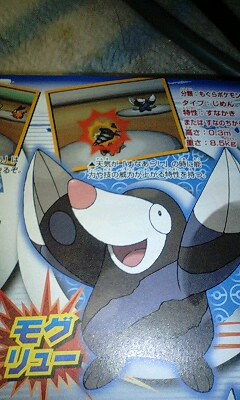 名称:モグリュー モグラ(鼹鼠) 属性:地面 分类:鼹鼠口袋妖怪 特性:すなかき(抛沙) 或者 すなのちから(沙之力):沙暴天气时能力和技能威力提升